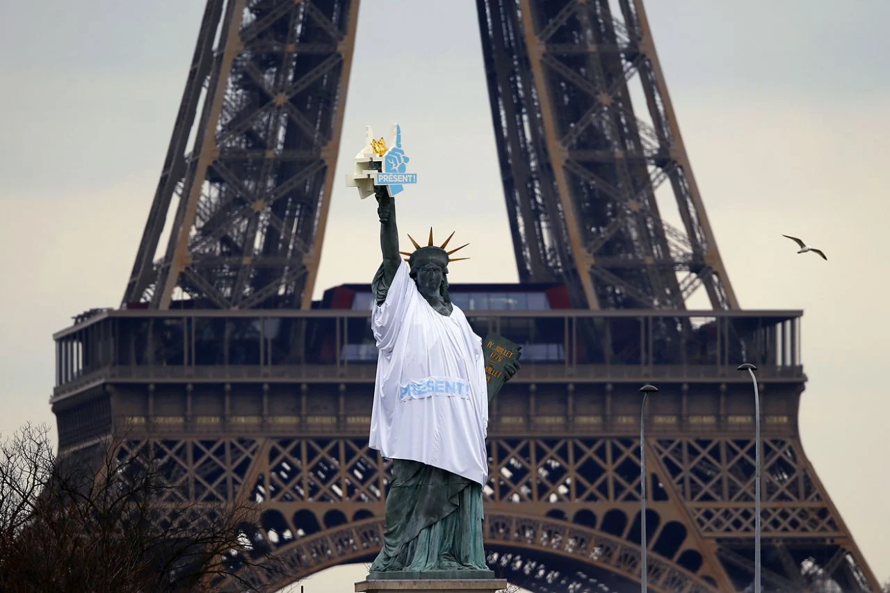 A replica of the Statue of Liberty is decorated with a t-shirt reading “Present” in Paris, March 23, 2017. French environmentalist Nicolas Hulot and Emmaus France director Thierry Kuhn launched an appeal called ‘Present’ to launch a solidarity movement with some 80 NGOs and associations just one month before the first round of the presidential election and to push the Presidential candidates for more solidarity in their campaign program. (Photo: Francois Mori/AP)