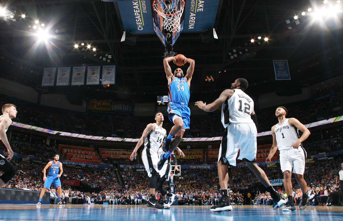 Josh Huestis, 34, of the Thunder drives to the basket against the Spurs on Saturday in Oklahoma City, Oklahoma. The Thunder won 104-94.
