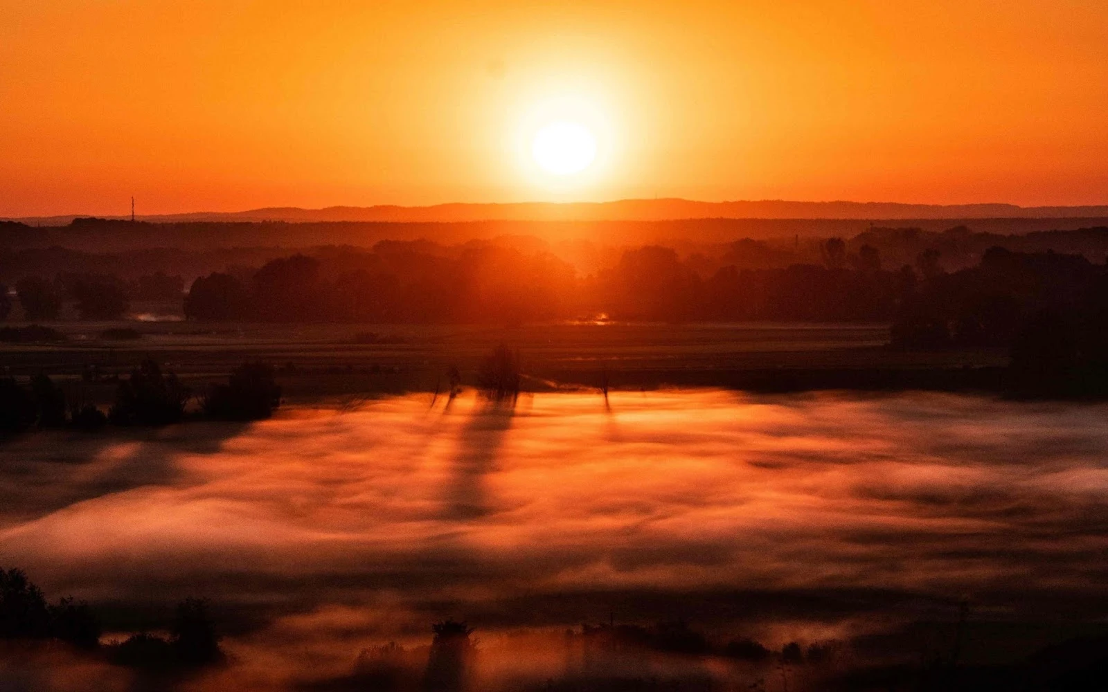 The rising sun burns off the morning fog near the village of Niederfinow in north eastern Germany