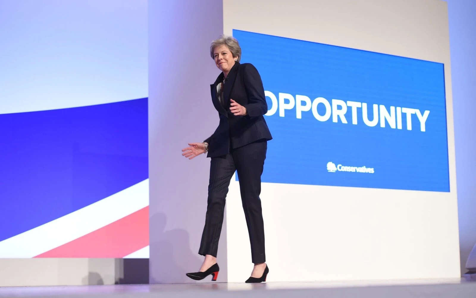 Theresa May dances onto the stage to deliver her keynote speech during the Conservative Party annual conference in Birmingham